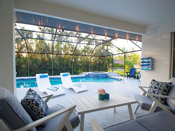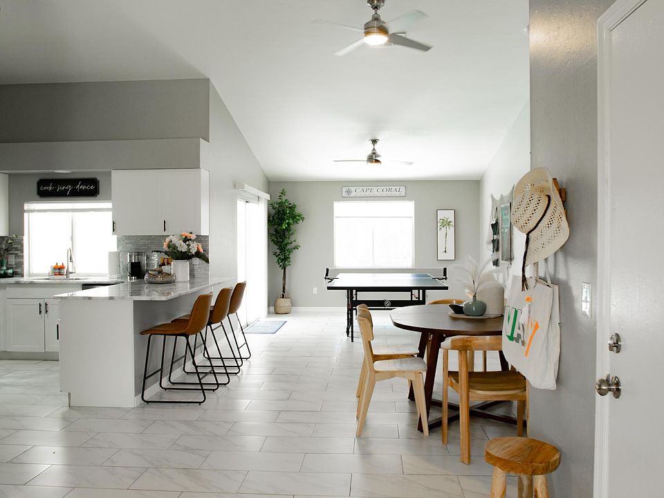UTILITIES INCLUDED IN RENT: - Internet (unlimited data at 600+ Mbps fiber optic) - Pool cleaning Furnishings optional, please inquire for details. The property is located in a quiet yet central area in southeast Cape Coral. It offers enough space for 6 people and enchants with its charm. The view of the heated saltwater pool (no smell of chlorine and particularly kind to the skin) and the green surroundings, including palm trees, gives you that holiday feeling at all times. The absolute highlight of this house is the outdoor space with furniture, a gas grill, and a dining area for 6 people. The saltwater heated pool has enough room for the whole family and the jacuzzi offers a more relaxed ambiance to enjoy a drink while getting a back massage with the jets. Sun loungers, pool toys, and floaties make relaxation and entertainment perfect. There is room for the whole family at the dining table. The kitchen is fully equipped with high-quality appliances and utensils as well as a food processor and a large side-by-side refrigerator. The kitchen bar is perfect for a quick breakfast or a snack in between. The 3 bedrooms are very comfortable and modern. High-quality comfortable mattresses ensure unique sleeping comfort. The master bedroom lets you wake up in the morning in a beautiful king-size bed with your own private bathroom and TV. The other two bedrooms are furnished with a queen size bed and 2 twin-size beds respectively. The master bathroom has double sinks and a walk-in rain shower. UTILITIES INCLUDED: - Internet (unlimited data at 600+ Mbps) - Pool cleaning - Pets allowed. Subject to approval by owner. - Non-refundable $200 pet fee.