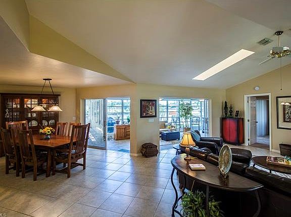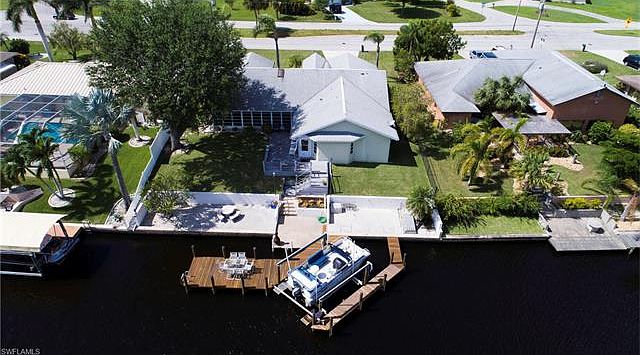 GULF ACCESS home located on BASIN just 10 minutes from the river. Enjoy coffee, cocktails, and dolphin from your trex deck or 10' x 20' over water dock. The 30' captain's dock provides full access to the 16,000 lb. boat lift complete with 30 amp service. Premier location near the intersection of the Rubican and Lido canals. Inside your new home you'll appreciate water views from the dining area, great room, kitchen, and all three bedrooms. Four sliders open to the central air conditioned Florida Room. Granite counter tops in kitchen. Wet bar in Great Room. Generous sized bedrooms with walk-in closets and California Closet storage systems. Large walk-in shower and warm neutral tile. Master bathroom updates include; dual sinks and vanity, oversized shower, and custom tile work. Whole house water softener. Tile in living areas. SE Cape Coral location convenient to entertainment district, churches, hospital, parks, schools, and just minutes to Ft. Myers, Sanibel Island, and Ft. Myers Beach. Room for custom pool.