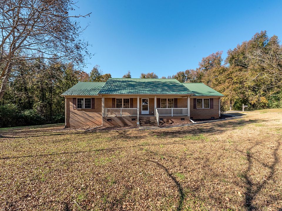 Lush tree filled 10 acres and brick ranch with basement ready to be transformed into your perfect space. Charming oversize rocking chair front porch. Metal Roof. Living room features vaulted ceilings and exposed beams. Spacious kitchen with built in breakfast area. The large rooms are the perfect canvas for designs and updates! Over-sized spaces and ample storage options - walk in-closets, laundry room, den, flex space in basement, large two car garage, storage shed, under house storage, etc. Nestled between Rock Hill and Leslie with easy interstate access. Come make this home your country-living dream!