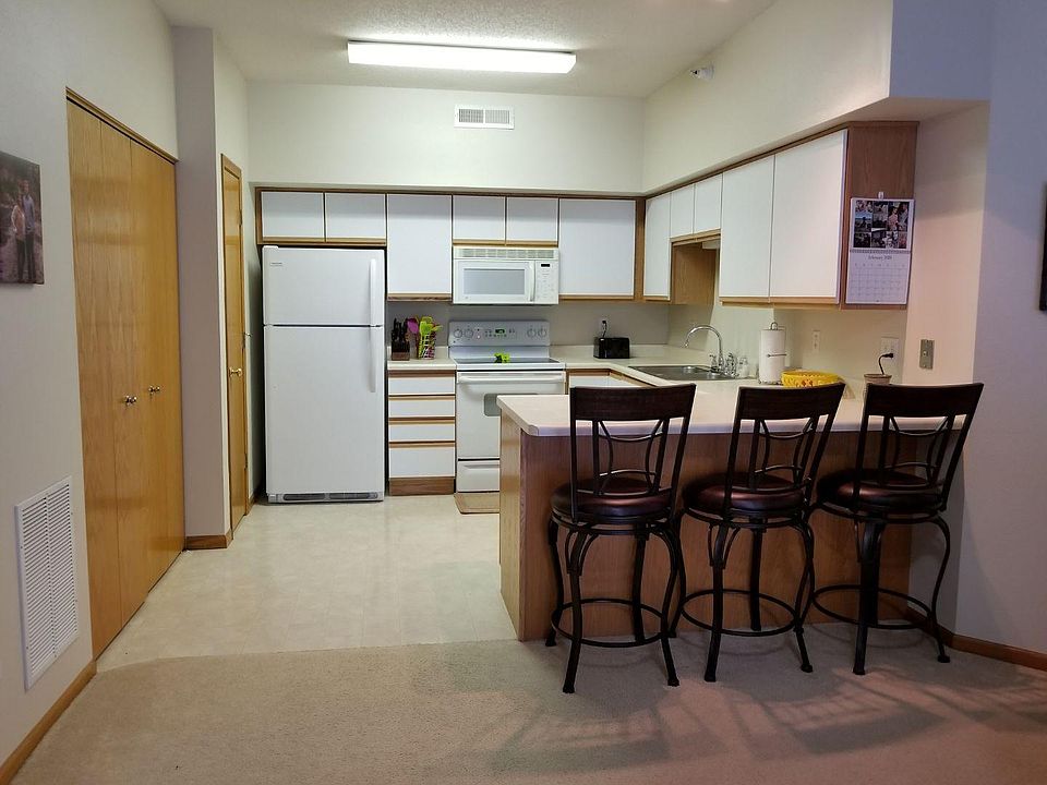 We own one condo with open floor plan, large living room and kitchen with breakfast bar. Two large bedrooms and full bathroom. Nice deck. One car detached garage and additional parking. Secure building close to bus line. Includes club house with workout room, business center and gathering space. Very close to Kirkwood Community College. No ACV. All residents must pass background check. We only own one condo so we're easy to work with. Owner pays trash & clubhouse fees. No low income. Must pass background check.