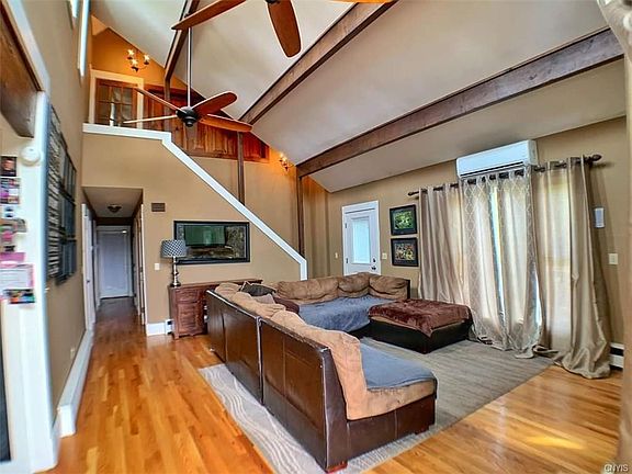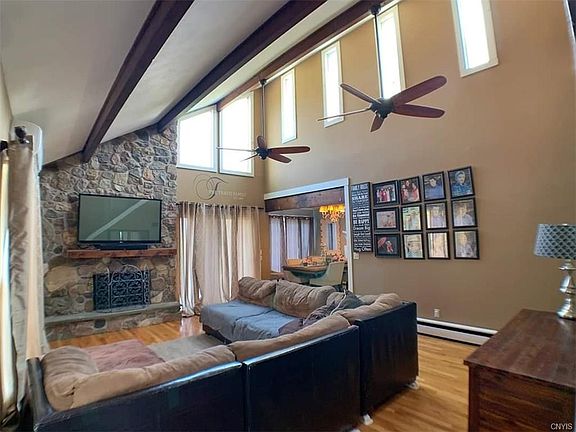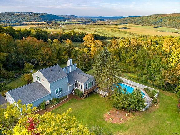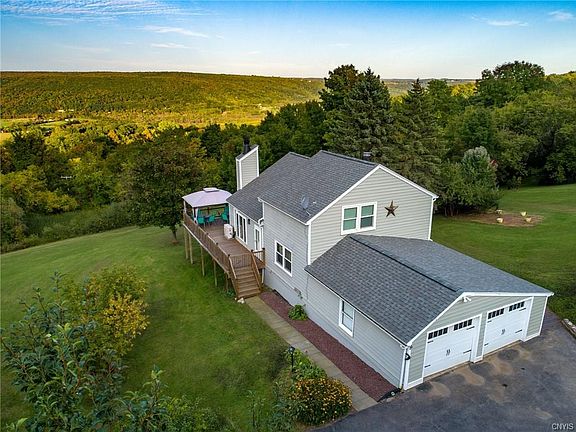 Country paradise! Once in a lifetime opportunity to own a small piece of heaven here in the Tully School District. This beautiful contemporary home offers 4 BRs, 3 full baths and approximately 2300sf of living space perfectly set on almost 4 acres of land. The main floor of this home offers a large living room with stone fireplace and vaulted ceilings, a separate den/living room, an updated kitchen with dining room, a full newly remodeled guest bath and two bedrooms. Go upstairs to the private master suite with remodeled master bath. The basement area offers another large bedroom/gameroom area and a 3rd full bath. Enjoy the breathtaking views of Syracuse, the Dome and the apple orchards from the new wrap around deck. With a gorgeous IG pool and many updates this home won't last.