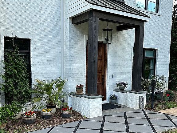 2-story alabaster- colored brick home on wooded lot with front porch cedar columns, black window frames and a stained mahogany door. 10 foot first floor ceilings with open concept. 12 foot quartzite kitchen island. Circa lighting throughout. Air tub in the master bath. Large media room with surround sound. Elevator. First floor with handicap access doorways