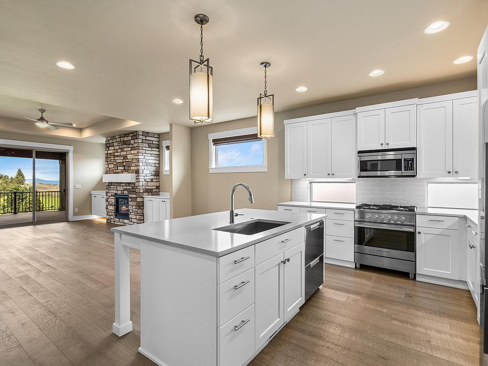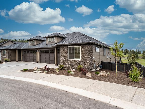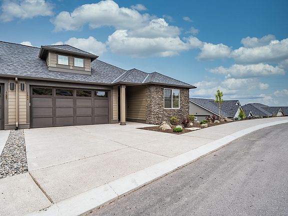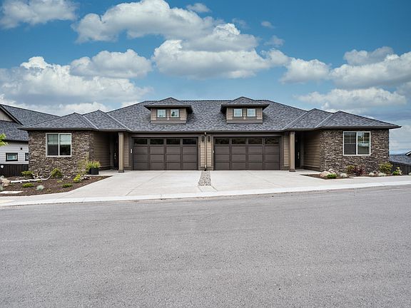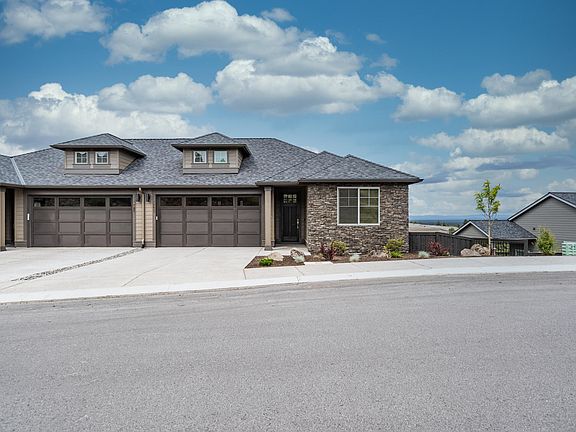 Inspiring views from this single level townhome, perched above the fairway at River's Edge Golf Course on coveted Awbrey Butte. Quality features like tall ceilings, 8' doors, stunning eng. wood flooring, tile floors in bathrooms & laundry, designer lighting, smart home features & upgrades like high end appliances, upgraded carpet & wood blinds throughout. Front bedroom & bathroom with soaking tub & shower w/ full tile surround. Kitchen boasts high end Fisher Paykel appliances, solid surface quartz counters & ample storage. Open concept living w/ gas fireplace, large stone surround & built-ins. Huge slider leads to a large, private covered patio w/ views for days. Primary suite is well appointed w/ ceiling fan, bathroom w/ floor to ceiling tiled walk-in shower, dual vanity, large walk-in closet and access to the rear deck. 3rd bedroom could also be the perfect office. Laundry room w/ large sink & storage. Common wall is only shared w/ garage and 3rd bedroom. End unit means xtra privacy.