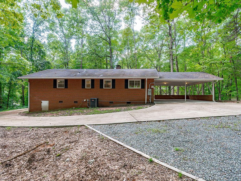 Nestled on over an acre of lush property, this ALL-brick ranch offers privacy and tranquility just minutes from US 1, 421, and the bypass. Step inside to find a spacious, open-concept living area featuring stunning solid oak hardwood floors and a spacious kitchen with plenty of cabinet space, granite countertops, stainless steel appliances, a stainless farmhouse sink overlooking the serene lot, and a beautiful hood vent. The living room, adjacent to the kitchen and dining area, is perfect for relaxing, centered around a charming wood-burning fireplace with a brick surround and wood mantle. The TV mount is already installed, making it easy to set up your entertainment space! Hardwoods continue through the bedrooms! The owner's suite boasts a walk-in closet and a private bath with a glass-enclosed tile shower. Bedrooms 2 and 3 with jack and jill bath with a tub/shower combo! Unique features include glass display cabinets in the kitchen, wine racks, a stackable washer/dryer with a barn door, and a rear-entry covered carport. Concrete driveway and front walkway were poured in 2021, with additional gravel parking. No HOA! Conveniently close to shopping, dining, and downtown amenities, this secluded retreat offers the best of both worlds.