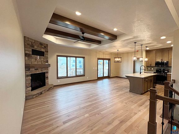 Welcome home to a grand and inviting entrance featuring a sky-high covered front porch and located in eastern Sioux Falls in Copper Creek Heights. Step inside and enjoy the spacious and airy entrance with up to 11ft high ceilings and extra wide wood beams stretching across the entry and living room ceilings. The open concept floorplan allows natural light to encompass each room. The living room features a stone gas fireplace; the kitchen features quartz countertops, custom tile backsplash, and walk-in pantry. An additional guest bathroom is hidden away from view off the drop zone and huge laundry space. The master suite is separated from the additional bedrooms and features dual sinks, quartz tops, and custom walk-in tile shower. Other features include upgraded 400 Series Andersen windows, finished garage with water and floor drains, and covered deck. Future Lower Level includes 2 beds, 1 bath, family room with fireplace, and huge storage room.