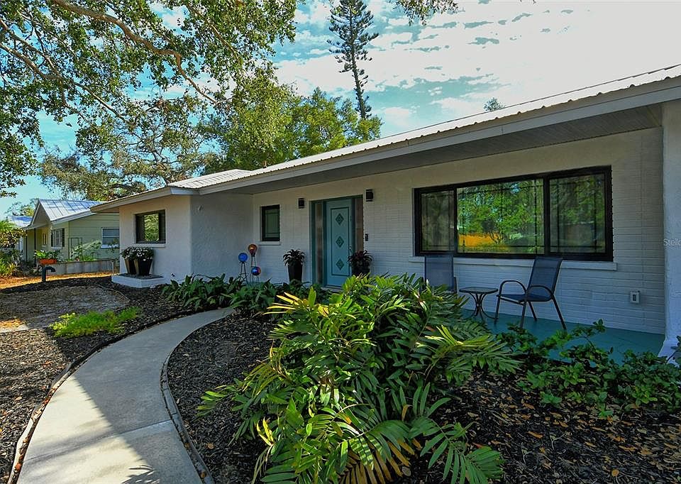 Discover the perfect fusion of classic Mid-Century Modern elegance and cutting-edge technology in this exceptional home, set on an elevated, over-sized lot. From the moment you step onto the wide front porch you’ll notice how timeless style meets modern convenience to offer comfortable, contemporary living. The expansive living room seamlessly flows into the bright and airy Florida room, where natural light pours in through windows that provide 180-degree south facing views of the sprawling, fenced backyard. The updated kitchen is open to the dining room, which leads out to a spacious screened lanai where you can enjoy Florida outdoor living. The bedrooms feature dual aspect windows, cedar-lined closets, and custom-built cabinetry, offering both functionality and charm. The extended garage is 31ft deep, wired for electric car charging and features a dedicated laundry area. Throughout the home, you’ll find meticulously preserved Mid-Century Modern features, from diamond-polished terrazzo floors to custom cabinetry and original crown molding, all while embracing the latest in modern technology, including discreet chandelier fan fixtures in two bedrooms and the Florida room. This home is as efficient as it is stylish, with a 2022 solar power system, new impact windows (2022), a whole-house water treatment system with reverse osmosis drinking water (2023), and new A/C ducts and insulation (2021). Two new water heaters (2023) ensure comfort and efficiency, while the durable metal roof and elevated position provide peace of mind in the face of storms. The solid block construction and impact windows provide additional security and protection. Plus, enjoy substantial savings on energy costs by harnessing the power of the sun. Full solar systems included with the home – no attached loans or future payments needed. More details of electricity cost savings available on request. Conveniently located near downtown Sarasota, Siesta Key’s award-winning beaches, and a wealth of shopping and dining options, this home offers easy access to I-75 and Tamiami Trail for an easy commute. As a resident, you'll have access to the Southgate Community Center, featuring five acres of nature, a community pool, gardens, and a paw park—a great space to connect with neighbors. Don’t miss the opportunity to own this captivating blend of Mid-Century Modern beauty and forward-thinking technology. Schedule a tour today and make this remarkable home yours!