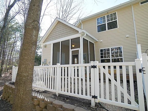 Adorable bungalow style townhome with first floor primary suite in beautiful Bedford at Falls River!! Secluded, quiet enclave with no thru traffic. End unit backs to wooded area, has fenced in space, screened porch and deck, and additional green space with guest parking adjacent! Spacious family/dining room with cozy corner fireplace. Large master bedroom, bath has huge garden tub, walk-in closet. Upstairs are two spacious bedrooms and another full bath. Don't miss this great opportunity to live in Bedford with all it's amenities: pool, tennis, clubhouse, pocket parks, active HOA with many social groups. Access to stores like The Butcher's Market, Dunkin' and a wine shop right in the neighborhood!! Some photos virtually staged to show potential.