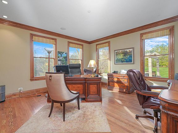 Situated at the end of a cul-de-sac, down the street from a nature preserve, this beautiful and meticulously cared-for, 4+1 bedroom, 4.1 bath home is move-in ready! Upon entry into the soaring foyer with beautiful hardwood floors, you will feel immediately at home. Off the foyer to the left, the hardwood floors continue into the living room with 9' ceilings, chair rail and picture frame molding. To the right of the foyer is the dining room with inlay hardwood floors and a Butler's Pantry with a built-in wine rack, sink, granite countertops and cabinetry. This kitchen! The granite kitchen bar comfortably seats 7! High-end stainless steel appliances include a sub-zero refrigerator, dishwasher, Viking range with six burners, a double oven and Viking microwave. Plenty of work surfaces and storage in this kitchen that also includes an island. This kitchen includes those three words some of us dream of at night: Walk In Pantry. The entire kitchen is open to the spacious family room that features a beautiful stone fireplace as the centerpiece. It's an entertainer's dream. Sliding doors lead out to a stone patio with built-in grill and fire pit and the large backyard. Also on this main floor is a large mudroom with built-in storage, access to the 3-car garage and a huge closet. Just before heading to the stunning hardwood staircase to go upstairs, you will arrive at the large dedicated main floor office with floor to ceiling built-in bookcases, hardwood floors and elegant woodwork. Upstairs you will find the spacious primary suite with private bath with heated floors that includes a deep whirlpool tub and walk-in shower with a built-in bench, body sprayers and a dual shower head. Also upstairs you have a guest room with en suite and two additional bedrooms and another full bath. All of the bedrooms include ceiling fans and architectural elements like tray and cove ceilings adding yet more architectural interest to this already fabulous home. The second floor laundry room has tile floors with ample storage and folding counter space. Moving down to the finished English basement you will find wall to wall carpeting, tall ceilings, storage, a 5th bedroom, a full bathroom, an exercise area, gaming area, kitchenette with full stainless refrigerator, wine refrigerator, sink, bar with granite countertops and the most exciting part-- the theatre room with a fireplace and beautiful crown molding! This is a high-quality, beautiful home with a very smart floor plan that works with the way you live.