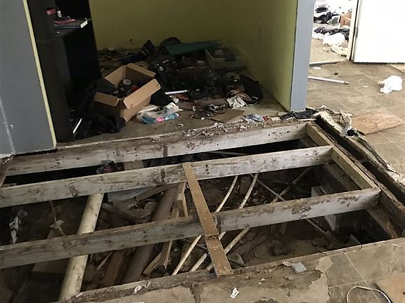 Foreclosed uninhabitable property. Inadequate drainage in front yard.