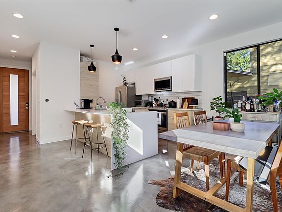 Set in a quiet pocket of East Austin, this design-forward home offers a rare feeling of living in a modern treehouse. Elevated views and natural light create a sense of calm, while you're still just a short walk from your favorite neighborhood spots. Built in 2019, the sleek contemporary design celebrates true indoor-outdoor living. The bright, open layout moves effortlessly from the sunken living room to a covered patio overlooking a large, private backyard. Architectural details bring personality throughout, including custom bookshelves, polished concrete floors, and vaulted ceilings. The kitchen features a generous quartz island, stainless steel appliances, and plenty of space to gather. Upstairs, both ensuite bedrooms feel tranquil and airy, each with walk-in closets and spacious bathrooms. A versatile landing space offers room for a home office, gym, meditation corner, art studio, or whatever your lifestyle calls for. With one covered parking space, street parking, and walkable access to the MLK MetroRail Station, life here feels effortless. Trails, parks, and neighborhood conveniences are all nearby, and Downtown Austin is just six minutes away - close enough for ease, yet far enough to retreat. Unfurnished.