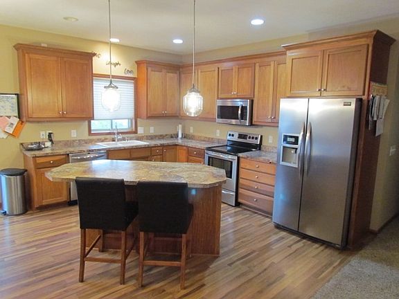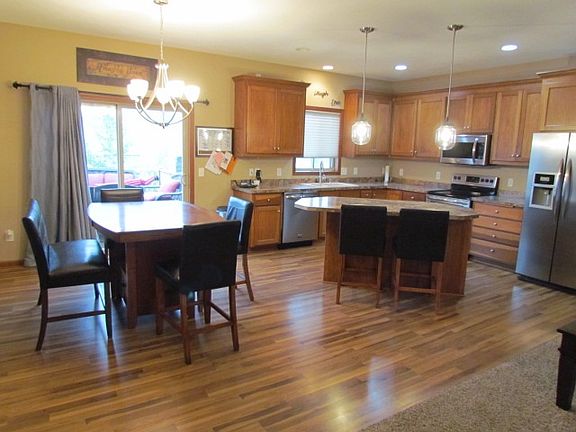 This Stunning 4 bedroom home sprawls across almost 2,500 square feet and is located in Minot's popular Eagles Landing Development! The main level has 2 bedrooms with 1 3/4 bathrooms including the master suite that has the ¾ bath with glass shower door, tile flooring, and a walk-in closet. The beautiful kitchen has plenty of recessed lighting with an island/breakfast bar and stainless steel appliances! The main level living room has 9' ceiling and open to the kitchen and the dining area. Just off the dining area is a patio door leading out to a 12'x12' deck over-looking the backyard. The large backyard is fully enclosed with a vinyl fence and also contains a Gazebo that is cemented down. The lower level daylight basement provides a large family room that is currently a theater room, 2 more bedrooms, a full bathroom and a laundry room with a basin tub. The 3 stall attached garage has a floor drain and high ceilings for extra storage!