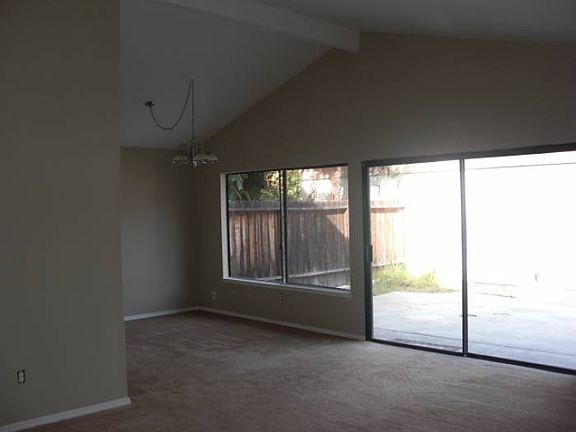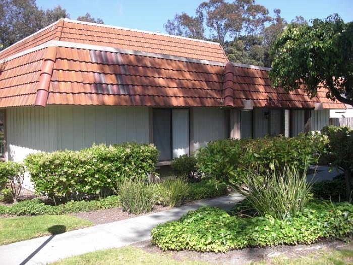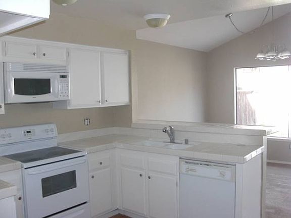 Desirable Tanglewood single level end unit with nobody above or below. Private patio/yard. 2 car garage with new roll up door & opener. Washer/dryer hookups. Central heat. Neutral paint, carpet, textured ceilings, new fixtures. Built in microwave, dishwasher. Vaulted ceilings. 3 bedrooms 2 baths. Very spacious, lots of storage. Large great room with big dining room and breakfast bar open to real nice kitchen. Lots of windows makes this home light and bright. Wonderful property sits on a greenbelt. Enjoy pool, spa, tennis and greenbelt walking trails. Most convenient to shopping and freeways. Friendly neighborhood. Trash service included in rent.