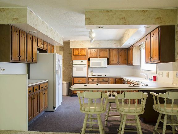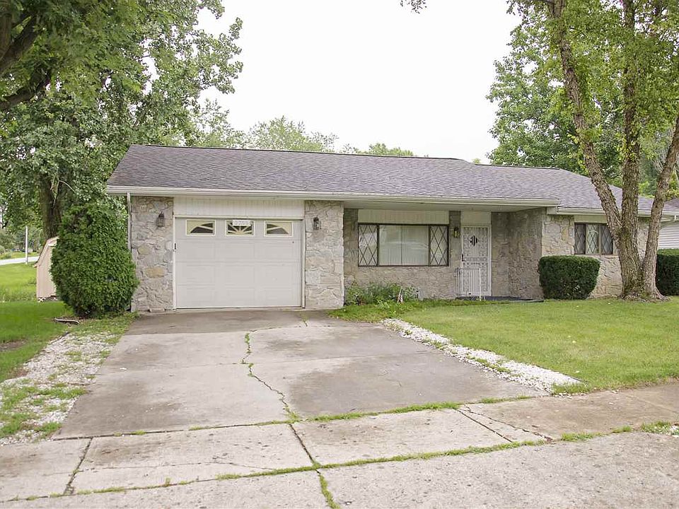 WOW - CHECK THIS ONE OUT! This stone home offers oversized Living Room with fireplace, Dining Room area and fully applianced Kitchen. Abundance of cabinetry in the kitchen. Bar stools will remain for the bar area. Home offers 1.5 baths. Newer items are furnace and c/air 5 yrs old, roof 1 yr old, water heater 2 yrs old, disposal 2 yrs old and a newer service garage door. You have a covered patio and a deck. Deck is not covered. Hot tub remains but is not operable. Located on a corner lot with stream running across back of property, 8x12 storage shed. This home is just awaiting a new owner.