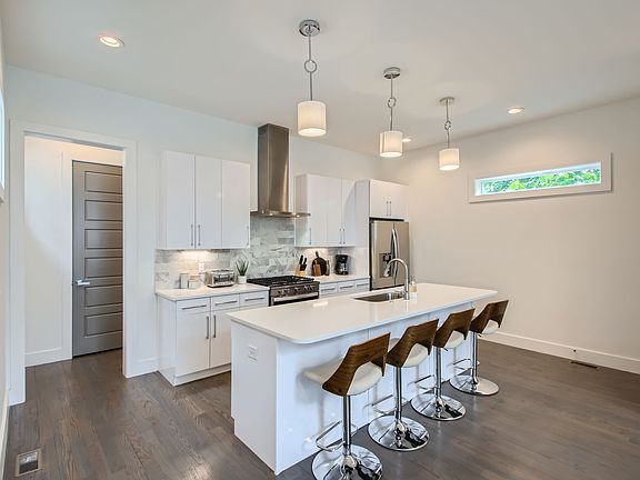 The living space is designed to impress, featuring elegant finishes, luxurious hardwood floors, and seamless flow from the living area to the dining room and designer kitchen. Upstairs, the primary suite is a true sanctuary a spa-inspired bathroom with an oversized glass shower, dual vanities, and an expansive walk-in closet. Three additional well-appointed bedrooms provide comfort and flexibility. A bonus room with a built-in wet bar opens directly to the private rooftop deck, where you'll find a cozy gas fireplace the perfect setting for elevated entertaining or quiet nights under the stars.