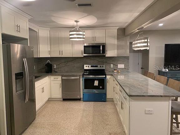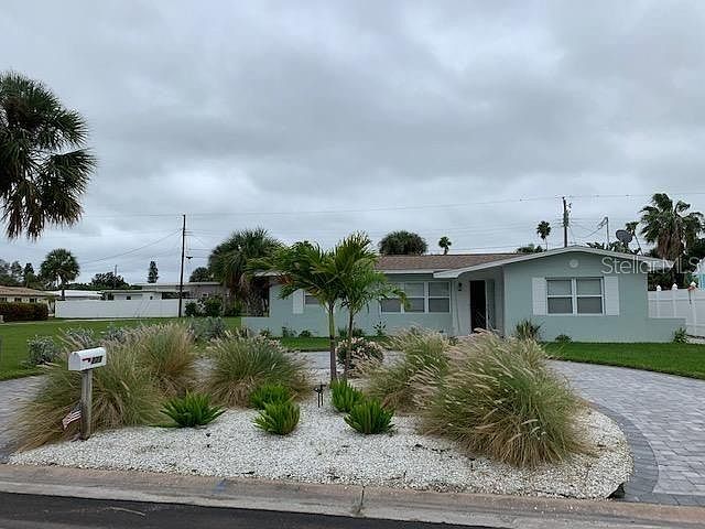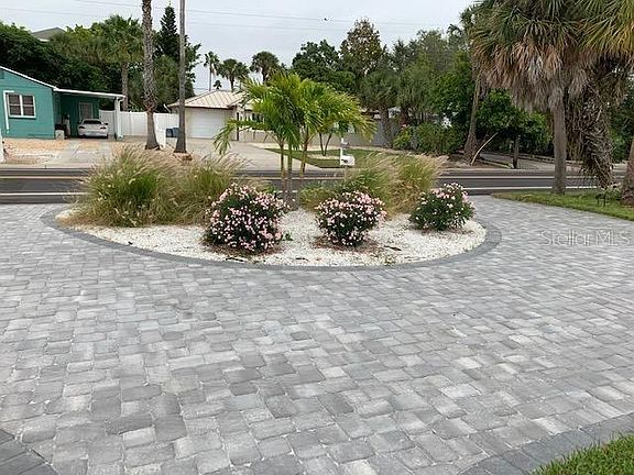 1000 steps to St. Pete Beach. Belle Vista complete rehab with top of the line finishes; everything is Brand new except the restored terrazzo floors. Open concept living kitchen area. Coastal Modern kitchen accented with high end quartz counters and full backsplash. Large master bedroom has walk in closet and gorgeous ensuite master bath with walk in shower designed with mosaic. Second bath has coastal theme and 2 large guest bedrooms with large closet space. Front load full size washer and dryer in home. 144 sq foot room with large windows serves as a large dining area seating 6. Brand new circular paver driveway. Second driveway at the rear of the property with a covered carport. Large backyard with new paver patio.