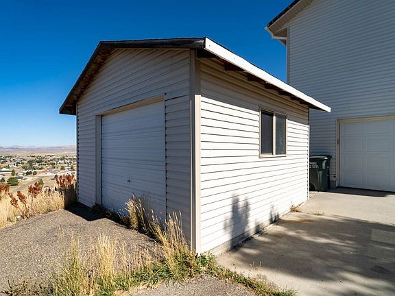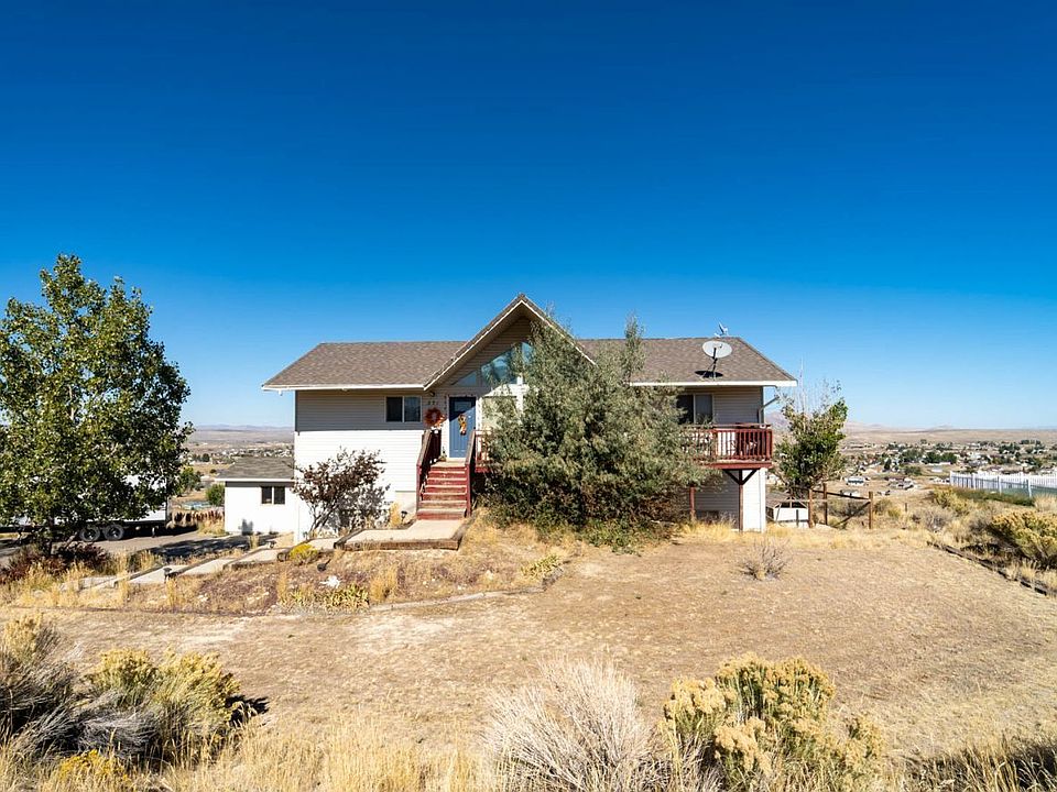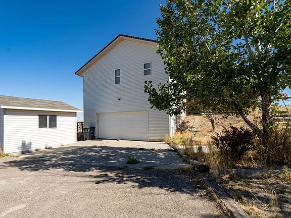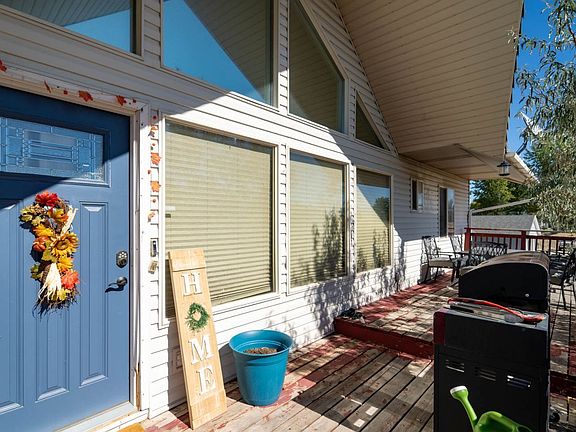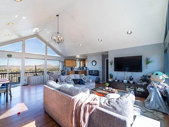 What great view this home has! Views of the mountains through the large windows and front deck and views of the Spring Creek valley in back. Main level has nice open floorplan with laundry off the kitchen. Primary bedroom has large wall closet and ensuite bath with double sinks, soaker tub and separate shower. There is also another bedroom and full bath upstairs. Wood deck off the dining area that overlooks valley and golf course. Unique spiral staircase to the walkout basement. Pellet stove in the basement, garage access and you can have a large second living area or a 3rd bedroom and full bath. There is also a storage shed with a roll up door