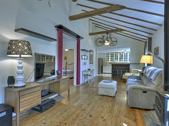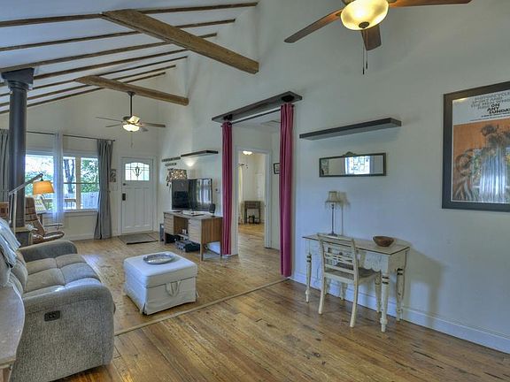 Charming Downtown Blue Ridge bungalow! This eclectic home has so much character. Travel inside to the oversized great room w/ vaulted ceilings, wood beams, wood burning stove & amazing natural light. Adjacent kitchen features butcher block counter tops, tile backsplash and large pantry. Large primary bedroom features vaulted ceilings, wood beams, fireplace, large sitting area and ensuite bath w/ double sink, walk-in tile shower & beautiful stained glass window. Two additional bedrooms & full bath with beautiful tile & modern sink round out the main level. Outside features fenced yard, garage basement storage, playhouse & wrap around driveway. Enjoy in town living within walking distance of downtown shops, dining and attractions. New roof 1/10/19, new water heater 2/16/19. *No short term rentals allowed*