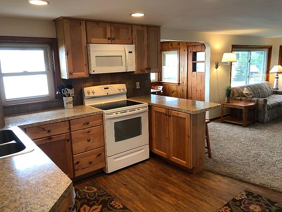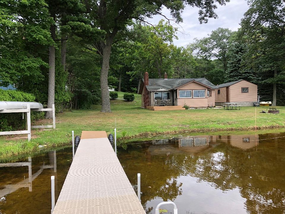 ADORABLE YEAR-ROUND 2-bedroom cottage with 80 FEET of FRONTAGE ON BAR LAKE. Walking distance to the road-end access to LAKE MICHIGAN! Fully furnished and move-in ready. Includes a great dock for your kayaks, A/C window units and a wood-burning fireplace. This is a very special location, offering lots of parking for your friends and family and a great yard. Deep 1-car garage with a work bench, plus a little basement for extras you'd like to keep inside. Composite Deck on the lake side is only 5-6 years old. Updated kitchen, appliances and furnace. Newer windows, carpet and flooring. Stacked Washer/Dryer. Fire pit and firewood are ready for you to enjoy. Just bring your marshmallows! Cottage sleeps 8, with the pull-out couches. Smart thermostat allows for remote control.