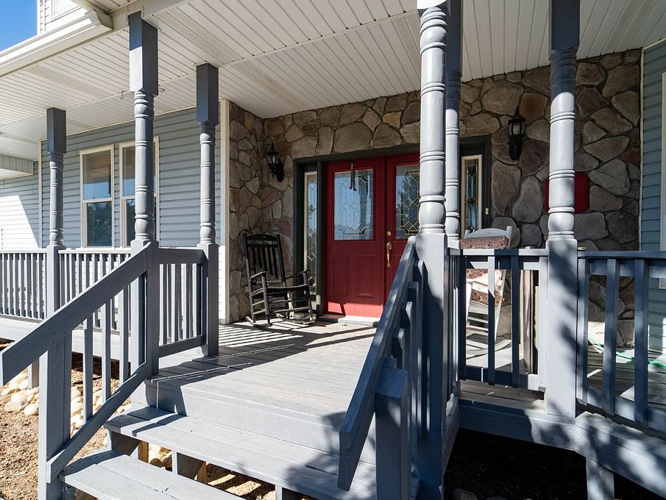 You are going to love the wrap around porch on this home! So many custom touches to this home, it truly has it all! Inviting entry way with an office off the front, a living room with french doors and full windows to take in the surrounding views also a propane fireplace, formal dining area with porch access. Custom kitchen with lots of storage, wall ovens, center island with cooktop and a nice sitting area off the kitchen with the pellet stove and work area, laundry and half bath. Upstairs you will find two large bedrooms, main bath and the primary bedroom with a sitting area and a propane fireplace along with large windows for great light and to take advantage of the views. The ensuite bathroom has a double vanities, bubbly tub surrounded by windows, separate shower and walk in closet. Storage shed, some fencing, a garden area with fruit trees and grapevine