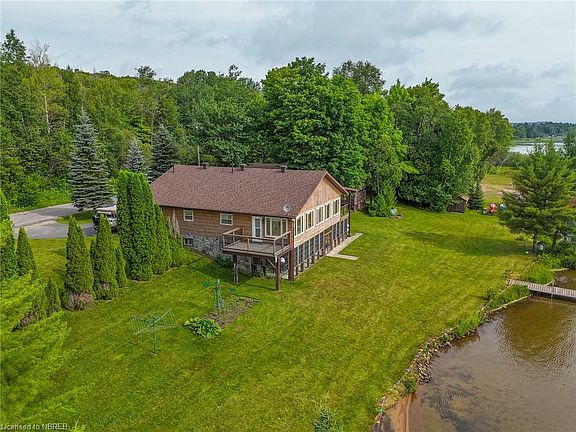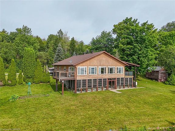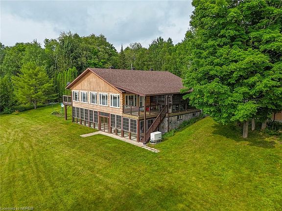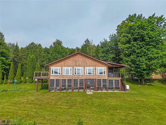 Nestled on the serene shores of Lake Bernard in sunny Sundridge, this stunning timber-framed retreat perfectly combines rustic elegance with modern luxury. Boasting 5 spacious bedrooms and 2 beautifully appointed bathrooms, this home offers ample space for family and guests. Step inside to be greeted by vaulted ceilings and a new custom Pizo kitchen that will delight any home chef. The newly installed windows and doors enhance the home's natural light, with large windows framing panoramic views of the sparkling lake. With 265 feet of pristine waterfront frontage, this property provides a private oasis for water enthusiasts. Enjoy the outdoors from the expansive 29 x 11.5 ft screened upper deck, or equally impressive 48 x 11 ft lower screened porch, both designed to maximize your experience of the stunning surroundings. The lower level features a convenient second kitchen and a walkout with separate entrance, perfect for guests or extended family. Completing this exceptional property is a 108 ft aluminum dock, ideal for boating and water activities. Don't miss this rare opportunity to own a piece of paradise on Lake Bernard, where unforgettable memories await.
