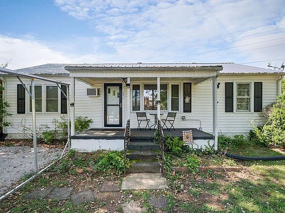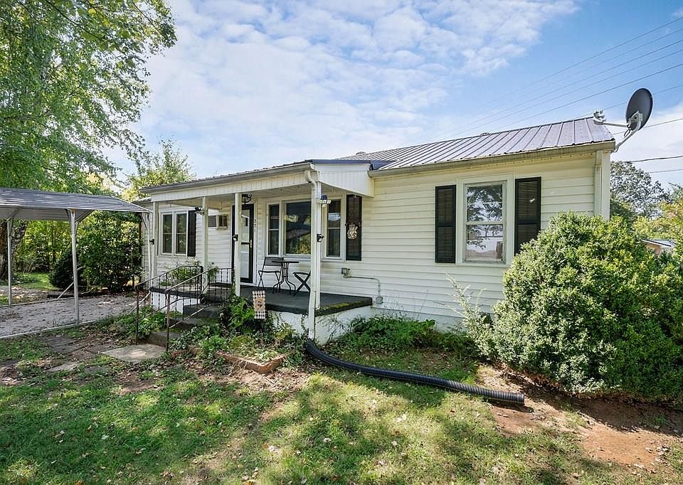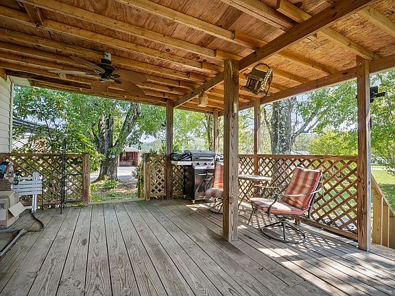 Rare to find an affordable home with a FULL walk-out basement, covered deck, large outbuilding/workshop (with lean-to additional storage) and another shed, and all on a level, corner, treed lot! The workshop has concrete floor, electric and an AC unit. Basement has door that opens near the workshop site PLUS a shower and sink to make clean-ups easy! The covered deck is perfect for morning coffee or cookouts! The porch swing is already there! Side-entry off deck leads to dining area with a barstool height counter open to the kitchen. Kitchen is wide with room for an island and the window over the sink look to back yard. Two bedrooms on either side of the living room which has a big window facing the front and the covered front porch. A large bathroom past the kitchen with washer/dryer. Steps to the basement between kitchen and bath. You can pull right up to the front of the house and park under the large carport. This home packs a lot onto a .38 acre lot!