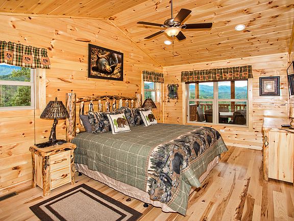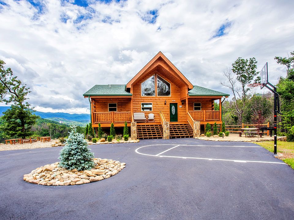 Enjoy spectacular views of Mount LeConte and Gatlinburg from this beautiful luxury cabin and from its' two adjoining build-able lots. You'll love the panoramic mountain views of Gatlinburg city by day, and the twinkling lights of the city by night. The two adjoining lots also have breathtaking views, all offer city water, sewer and gas utilities. On one of the two lots you'll see a lovely play area for young and old alike, including swing set, basketball court, and great area for family picnics. It offers quality craftsmanship both inside and outside, each level has a gas log stacked stone fireplace. Gleaming wood floors are on the main level, and beautiful slate tile downstairs. The main level has split floor plan with two King Master Suites - one on either side of the great room, and each has outside deck access. The great room has towering cathedral ceilings and a high and wide wall of windows to enjoy those breathtaking views, and you can access the two outdoor decks from inside. The fully equipped kitchen has spacious cabinetry, stainless steel appliances, and deep sinks & granite countertops. Follow the pretty stairway to the lower level where you'll find 2 more King Master Suites - one on either side of the recreation room and each has outside deck access. The recreation room includes a large sitting area, plus shuffleboard, arcade, and Atomic air hockey tables, plus the second gas log stacked stone fireplace.