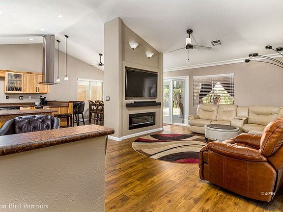 "REMODELED".....NO HOA...RV PARKING. Owner has spared no expense ($50,000) on remodeling and upgrading this home. Kitchen has been reconfigured...you'll love this contemporary design. Vaulted ceilings are found in the living room, dining area and kitchen with a striking tall wall that separates the living room and dining area with two new electric fireplaces placed on either side of the wall. NEW KITCHEN CABINETS, NEW LAMINATE FLOORING, NEW PAINT THROUGHOUT INSIDE OF THE HOME, NEW PAINT ON THE EXTERIOR OF THE HOME, NEW KITCHEN COUNTER TOPS, NEW STAINLESS STEEL APPLIANCES, (2) NEW ELECTRIC FIREPLACES, NEW OVERHEAD STAINLESS STEEL VENT OVER OVEN RANGE, NEW FRENCH DOORS with frosted tint leading into guest bedroom with newly installed sliding glass door leading out of the guest bedroom onto a custom designed deck, masterfully cut around a large mature tree. Guests have their own private deck. French doors frame the entrance to the master bedroom. Master Bedroom has an amazing well designed walk-in closet as well as a sliding glass door leading out to a large covered patio Fully fenced yard...low maintenance. Hot Tub is excluded from this sale.
