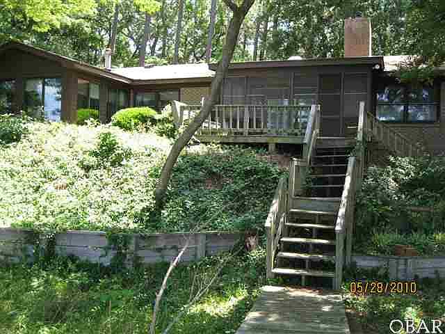 RARE 150 FEET SOUNDFRONT HOME SITUATE ON HIGH ELEVATED RIDGE ** LOCATED IN MUCH SOUGHT AFTER NEIGHBORHOOD AND LOCATION WITHIN SOUTHERN SHORES ** PROPERTY IS PRICED TO LAND VALUE WITH MINIMAL VALUE ATTRIBUTED TO THE VALUE OF THE HOUSE ITSELF ** HOME NEEDS UPDATING BUT HAS A GREAT DESIGN / FLOORPLAN ** LARGE OPEN FAMILY ROOM W/ WOOD FIREPLACE AND BOOKSHELVES ** LIVING ROOM IS OPEN TO FAMILY ROOM AND DINING AREA ** SOUNDFRONT DINING ROOM (SELLER TO REPLACE EXISTING CHANDELEIER WITH ANOTHER CHANDELIER) ** NICE SOUNDFRONT EAT IN KITCHEN WHICH LEADS OUT THROUGH SLIDING GLASS DOOR TO SOUNDFRONT SUNROOM! KITCHEN FEATURES CENTER ISLAND, COUNTER TOP RANGE DESIGN, LARGE PANTRY, LAUNDRY, 1/2 BATH, DOOR TO GARAGE! THERE IS A SECRET DOOR IN THE HALL CLOSET WHICH WILL LEAD YOU TO A NARROW STAIRWELL TO A HUGE UNFINISHED BASEMENT ROUGHLY 1900 SQ FEET - WITH SMALL GARAGE DOOR TO REAR YARD ** YOU WILL HAVE TO SEE THE CIRCULAR DRIVE - GREAT FOR ENTERTAINING ** IMAGINE RELAXING IN THE SUNROOM WHILE ENJOYING THOSE CAROLINA SUNSETS LEAKING THROUGH THE SHADE TREES & THE SHIMMERING WATER AS IT REFLECTS THE CHANGING COLORS AS EVENING GIVES WAY TO NIGHT ... THIS IS AS GOOD AS IT GETS! ... ** CALL FOR COMPLETE PHOTO ARRAY!