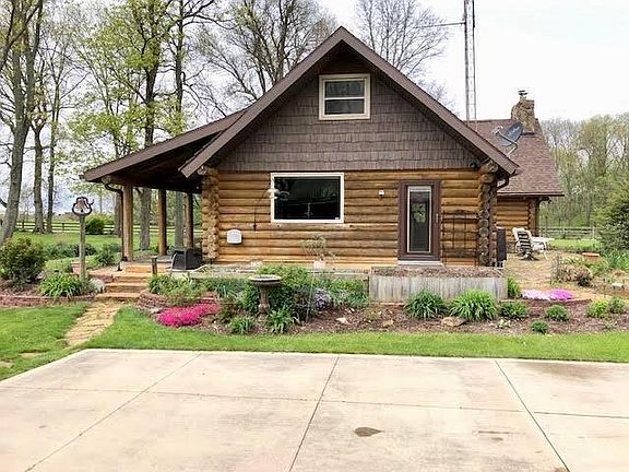 Log Cabin on 8.79 Acres w woods & creek! 3 bedrooms, 1 full bathroom & 2 half bathrooms. Family room has a cathedral ceiling, ceiling fan, wood burning stove & trapezoid windows. Open eat in kitchen is very large, has an island, desk area, lots of cabinet/counter space, several windows for natural light, appliances include refrigerator, microwave, dishwasher,convection oven & gas stove. Huge first floor master bedroom has 2 closets, ceiling fan & textured ceiling. First floor laundry. Solid wood doors. Wrap around front porch. Patio. Concrete driveway. 3 car garage with workshop has electric & heat. Electric panel has a back up panel that can be attached to generator to run the electric during power outages. Furnace, central air & well pump new 2015. This is a very well cared for home.