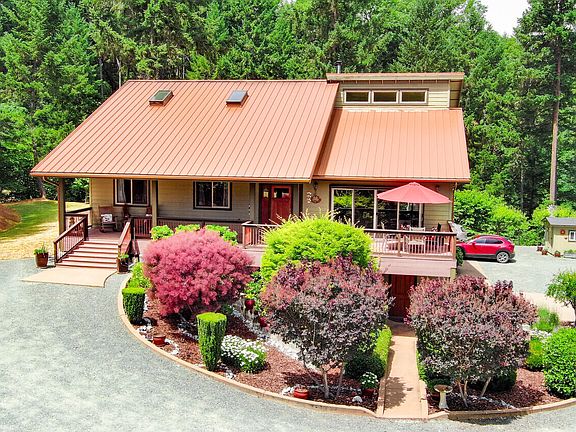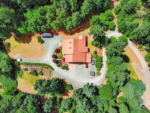 Private & Secluded 15.54 Acres close to the Wild & Scenic Rogue River! This craftsman contemporary home features a metal copper colored roof/gutters! The large covered front porch escorts you into the spacious foyer, where 20' ceilings invite you to sit & enjoy nature at its finest. Majestic A-frame wood encased windows, tile floors, custom light fixtures, concrete countertops, custom cabinets are just a few of the high-end amenities. Most daily living is done on main level. The Primary Suite has its own private deck and luxurious Wet Bath. Three add'l bedrooms, a full bath and utility room are also on this level. The upper level is currently used as office space with an area for family room, library, 2nd office, hobby room & loft area over living room. Lower level is perfect for extended family living with its own full bath & exterior entry. 30x85 Garden, a totally wired chicken coop & over 15 acres to roam, backed by BLM. Ask for amenities list !