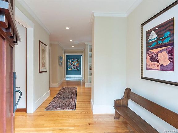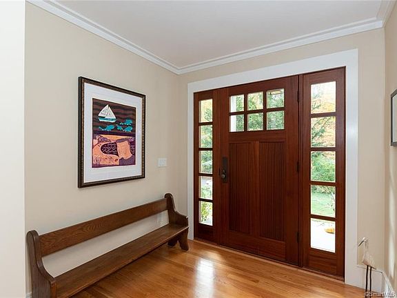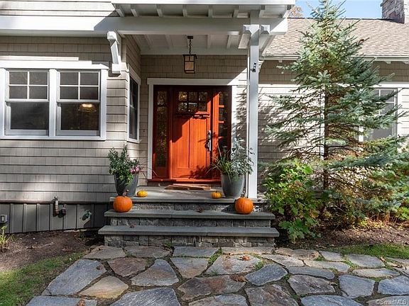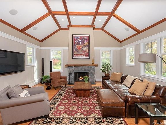Special custom crafted home with stone, cedar, gables and mahogany front and garage doors. This 5 bedroom 4.5 bath home has been masterfully renovated into a Contemporary Craftsman by architects Harrison Gill (Norwalk) and Stephen Tobler (Jackson, WY), creating a modern, highly functional space for an active family who enjoys entertaining. Red oak floors give visual warmth to the entire interior while hydronic radiant floors in the entry, great room, mudroom and MBaths warm each step you take in your slippers or bare feet. The great room soothes with cherry coffered cath ceilings, cherry mantel and stone fireplace. Gracious DR with built-in cabinets, arts and crafts tile fireplace, all opening directly to the deck. Enjoy the private 2nd fl. large master bedroom with cathedral ceilings, large WIC and spa-like master bath with limestone and marble tile and counters, shower and deep soaking tub. A separate office is part of this MB suite. On the main floor 2 BR's share a newly renovated dual sink full bath. The 3rd BR features an updated en-suite full bath with mother of pearl concrete countertops and beautiful glass tiled shower wall. A large bonus rm has an elevated wood stage great for childrens theater! The LL serves as yet another large hang out space, complete with 5th bedroom, its own entrance and private full bath, perfect for guests, nanny or in-laws. Enjoy a stroll along the river of the Aspetuck land trust and close to Wilton, Westport and Weston town centers!