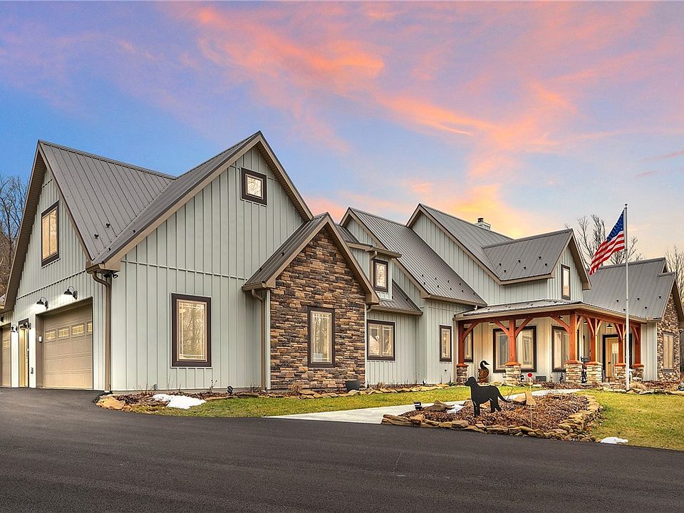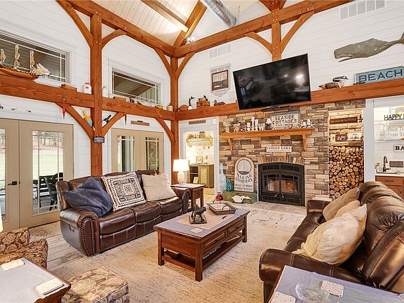 Impeccable lake house, custom built 4 bdrm/4bth Mid-Atlantic Timber Framed Home w/Geothermal HVAC system and structurally insulated panels. Paved driveway leads to an attached 3 car/1088 sq ft garage with heated floors and ample storage above. The heated floors are continuous (white aged barn wood) porcelain tiles. The Great Room impresses with exposed timber framing reaching 26’ and wood burning fireplace. The kitchen has Stonebridge custom quarter sawn oak cabinets, quartz counters, stainless appliances, and a large island. 2 master bedrooms w/ensuites & walk-in closets on main flr. 2 floor has 12 x 25 bedroom with sitting area, full bath and adjacent bedroom/den. Sale includes apx. 9 acres in the commercial zone, 2 in R1 zone & 100' of lake frontage w/beautiful views, a pavilion, shed & electric. This home is protected by a whole house security system. Must see mechanical room with in & outside access. The community has 2 golf courses, restaurant w/lodge & a 750 ac. private lake.