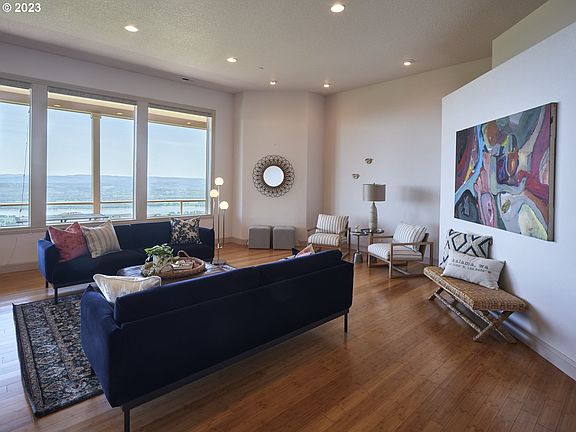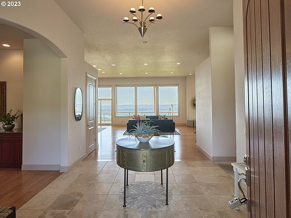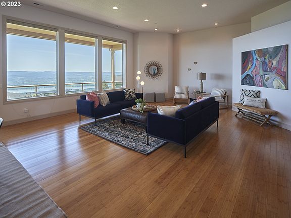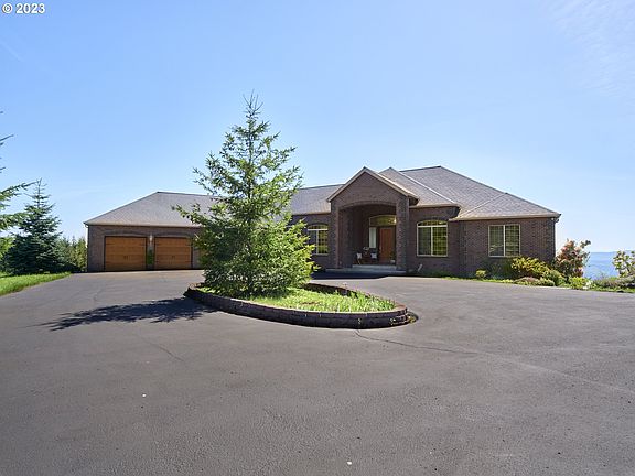 Expansive Columbia River view from this lovely brick home. 3600 sq feet on the main floor with daylight basement below. Primary suite, plus 3 bedrms,3 baths, office, living and dining on main floor. Lower level has a media room, bathroom, theater and rec rms. Attached 3 car garage plus fully finished 6 car shop. Ideal for your car collection, toys and hobbies. Fenced and gated, paved circular driveway.