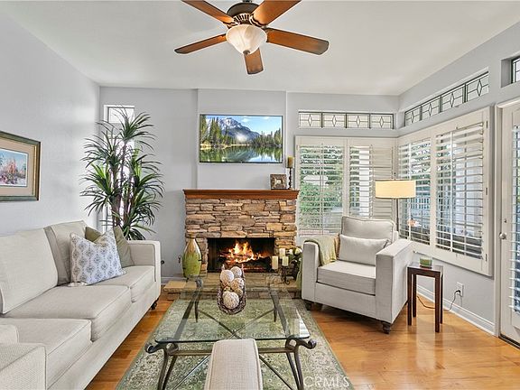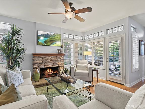 Welcome to this charming single-level, ground-floor condo in the highly coveted Breakers community of Laguna Niguel, just moments away from world-renowned beaches and luxury resorts. This spacious end unit radiates warmth and sophistication, featuring elegant plantation shutters, a cozy living room fireplace for cool winter nights, and a serene peek-a-boo ocean view from the expansive back patio. Step inside to appreciate details like rich wood-style flooring, polished granite countertops, and soft-close cabinetry. The open-concept layout is bright with natural light, with recessed lighting adding ambiance in select areas, and the kitchen comes well-equipped with stainless steel appliances. The primary suite offers a tranquil retreat, complete with a fully remodeled bath accessible through a stylish barn door, showcasing a walk-in shower, quartz countertops, and a generous walk-in closet. The second bedroom is thoughtfully designed with a beautiful built-in wood desk, creating the perfect space for a guest room and home office. Outside, the private patio provides an inviting space for relaxation or entertaining, and the condo includes an oversized single-car garage with ample storage plus an extended driveway for additional parking. Recent upgrades, such as new PEX plumbing, enhance the home’s appeal. Exclusive gated access to Ocean Ranch opens up a world of shopping, dining, and entertainment, including the Cinepolis theater. Enjoy the quintessential coastal lifestyle with nearby parks, beautiful beaches, scenic trails, premier golf courses, and top-rated schools. Relax by the community’s resort-style pool and spa, and make this lovely condo your year-round haven, vacation escape, or a smart investment in coastal living.
