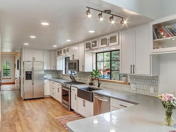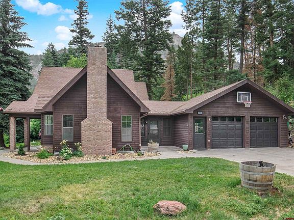 Beautiful home nestled in the pines on Corbett creek. This home has a open floor plan with a oversized kitchen that was remodeled in 2020. With four bedrooms plus a office there is plenty of room for the whole family. Relax on the sunny concrete patio while listening to Corbett creek and enjoying the pines. Vaulted ceilings in the Master, Living room, and Dining room. Wood fireplaces in the living room and dining room provide heat and ambiance. 2 car garage and lots of parking outside. Separate laundry room. Beautiful views of the mountains. Only 5 minutes to the Ouray Hotspings and great shopping and dining.