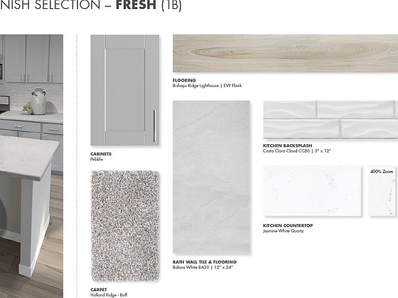 The sizeable kitchen island anchors the open-concept living area. With five bedrooms, there's plenty of room to spread out. Stone cabinets with marble-look white quartz countertops, light taupe EVP flooring with beige tweed carpet in our Fresh package.