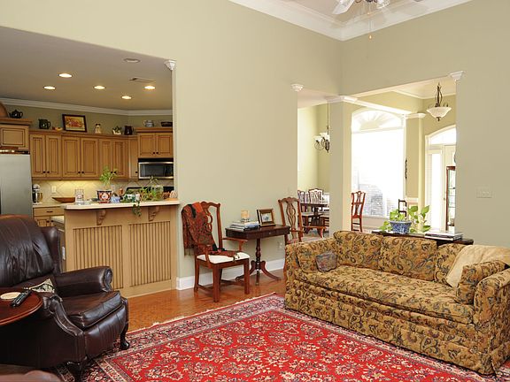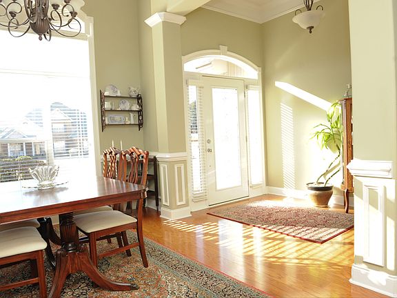 This home has so much to offer. The foyer entry leads you to the dining room with its tall ceiling, crescent topped window and finished with decorative chair molding and separated by a rounded corner column finished in the same manner as the walls. You will notice all the wall corners in this home are rounded. The living room is just ahead of the foyer and dining area and boasts beautiful wood flooring, a gas log fireplace and windows with the decorative accents atop. The kitchen is separated by a tall corian topped breakfast bar and has walls of cabinetry housing stainless appliances and encompassing a breakfast area with a built in desk. The main bedroom is just down the hall behind the kitchen and has an additional area with a built in desk space. This room allows enough space for a sitting area behind the desk area. The main bath has a separate shower, jetted tub, double vanities and a split walk-in-closet. Down the hall towards the garage entry is the laundry room and a spacious half bath. On the other side of the home are the additional three bedrooms sharing the hall sink, also with double vanities. Out back is a detached storage shed and covered patio area. This one is too good to be true. A beauty just waiting for you!