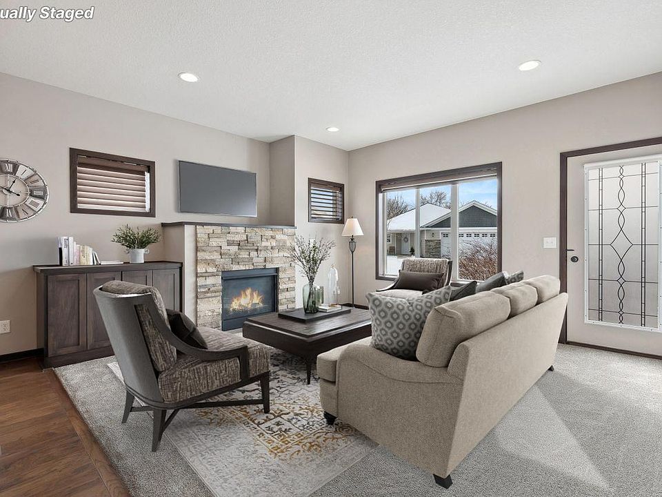 Impressive Novak Fleck built townhome in small Coon Rapids development. Quality interior features provide a modern aesthetic and include new carpet and pad, engineered wood floors, tile floors, granite countertops, gas fireplace with stone surround, custom window coverings, neutral paint, oil-rubbed bronze finishes, and 9' knock-down ceilings. Open kitchen with stainless steel appliances, an oversized 9' island w/sink and storage, walk-in pantry and plenty of cabinetry. Private primary bath features dual sinks, shower with built-in seat, and walk-thru to the walk-in closet. The second bath features a walk-in bath tub with handheld shower, fiberglass surround. Laundry room with front-loading washer and dryer, and folding table. Upgraded exterior features include cement board siding, concrete driveway, irrigation system, large rear patio, and a covered entryway. Conveniently located near area restaurants, retail, medical facilities, highway access. Your new low-maintenance home awaits!