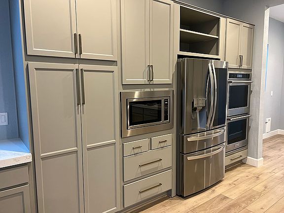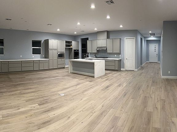 Toll Brothers - Castano - Cresta Model - Modern Farmhouse elevation - single story. Smart home built 2021- 2300 square feet- 3 bed 3.5 bath including generation suite (bedroom, living area, and kitchenette) with exterior door access. Expanded patio with lighting/fans, ultra shower in primary bath 2 head/handheld, California Closets in primary walk in closet and laundry room, Provenza Moda Living LVP (first crush) flooring throughout with the exception of upgraded carpet in middle bedroom, upgraded 5 inch baseboards throughout. Sherwin Williams satin sheen paint throughout, epoxy garage coating in 2 car garage, garage ceiling storage racks x3, in wall medium pet door in mud room. Whole house soft water system with carbon filter and reverse osmosis filtration at island/fridge, 3 zone ecobee HVAC smart home system, 4 CCTV wired cameras, 2 Ring floodlights with cameras on sides, Ring doorbell, floodlights on back patio, quartz countertops, waterfall edge on island, upgraded cabinets with extended nook cabinets in dining room, upgraded Lutron remote enabled smart lighting, 12 foot stacked sliding door in great room, 9 foot slider in primary bedroom, Kitchenaid upgraded appliances (gas) with double wall ovens, low E windows throughout, custom Shade Store fabric modern roman style window coverings, fiber community with Cat 6 access in all bedrooms, great room, and gen suite living area, patio wired for cat 6 and TV. Mesh WiFi system and upgraded low voltage options designed by Acoustic Design. Upgraded and additional can lighting in great room and gen suite living space. Whole home fire sprinkler system. Ceiling fans in all bedrooms, great room, gen suite living space, and 3 outside on patio. Rain Bird Drip system. Wired and battery backup smoke detectors with dual carbon monoxide detectors at bedrooms. Backyard full landscape in 2023 custom designed. Freestanding patio with privacy side wall and electrical (set up for above ground spa with both 120/220v and underground electrical piping from house to patio), upgraded pavers, turf, landscaping tied into drip system, and low voltage lighting. Side yard custom gate with full swing that leads to specially designed area for dog(s) where there is access to the doggie door, turf with 3 in ground sprinklers to aid in cleaning or heat mitigation. Dedicated gas hookup on side of house for BBQ attachment. Custom trash/recycling enclosure off side yard by side gate that enables you to store your cans out of site yet not in the garage or in the backyard.