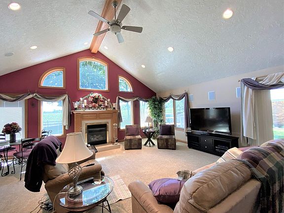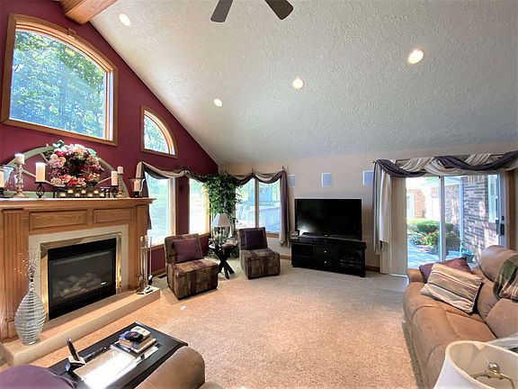 Immaculate Open Concept Ranch! This all brick home has a dramatic family room with cathedral ceilings and floor to ceiling windows flanking the natural gas fireplace for cozy nights or large gatherings. The dining room also features a gas fireplace with full view of the family room and Kitchen. This well built solid wood kitchen features a full suite of appliances, breakfast bar and a window with a wonderful view of the the back yard and composite deck. The master suite has an updated walk in shower, vanity and large closet. The guest bedrooms are of ample size and share a full bathroom with tile flooring. The formal sitting room offers a large wall of windows and comfortable views. This home also features a 2 car attached garage and an over sized 2 car detached heated garage for all of your toys, hobbies and crafts. The back yard has a wonderful southern exposure with shaded views of Indiana farm ground. Seller states there is hardwood flooring under the carpeted areas in the original floorplan. This home has so many updates a list of them is attached to the MLS.