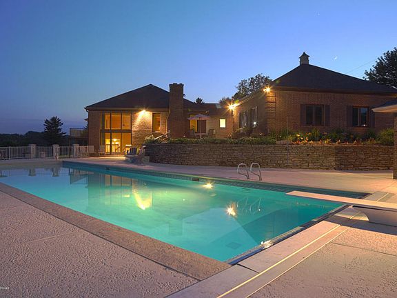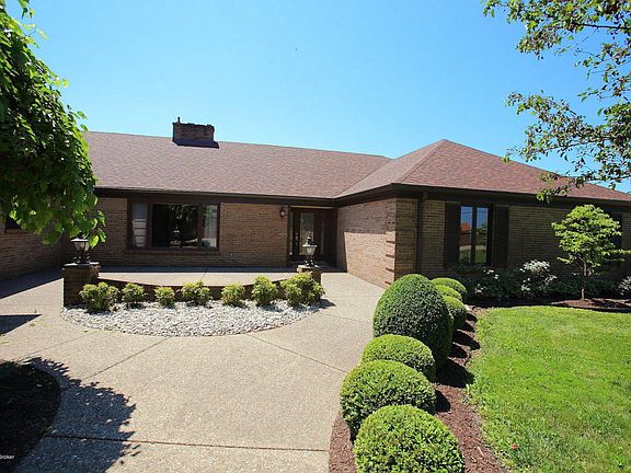 Welcome to 2710 Heights Lane! This fantastic 5-bedroom walk-out ranch has 7,410 finished square feet with 4 full baths & 2 half baths. It sits at the end of a private drive shielded by a 220-foot brick privacy wall, overlooking Eagle Creek Golf Course with spectacular views of its pool, the lakes, the golf course, and the hills of Oldham County. These views are enjoyed from a large 2 level deck, or seen through spacious tinted windows, or from a brick sun patio overlooking a lighted waterfall pouring into the swimming pool. This 60-foot inground gunite Olympic size heated swimming pool features an automatic safety cover, a separate air-conditioned pool house with changing and bathroom facilities, a heated shower, and a spacious pump and equipment room. The separate garage building off