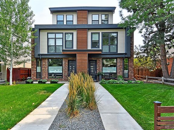 Impeccably maintained duplex in a great location, near West Highlands and Sloans Lake and 1 mile from downtown. This home is spacious and open with beautiful finishes including quartz counters and high end appliances including a built in wine cooler. The kitchen, living and dining rooms are perfect for entertaining with built in speakers and open up to the backyard. The large master has a five piece bath that includes a large frameless glass shower and stand alone tub. Laundry and Office with an ensuite bathroom are on the second level with the master. The third floor entertaining room has great indoor and outdoor space with incredible views of downtown Denver, 1/2 bath and a wetbar. This home affords privacy for you and your guest with a fully finished basement with an additional bedroom, full bath and living room. A two car detached garage, hickory hardwood floors, open riser stairs, modern fireplace and front porch are a few additional features. This home is a must see.