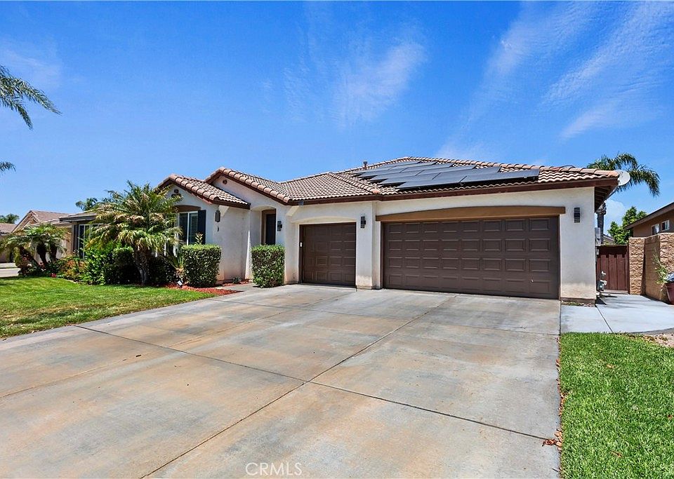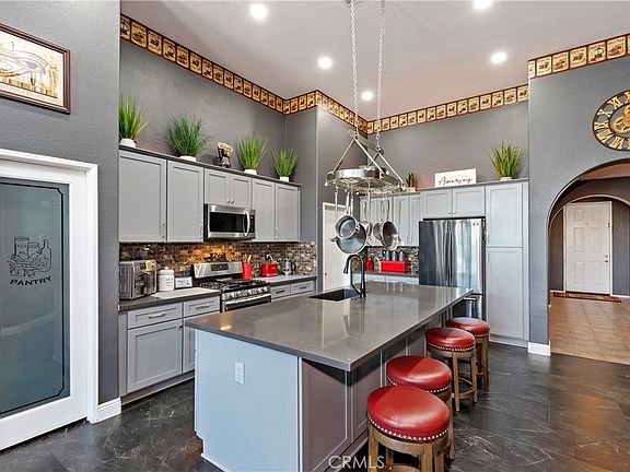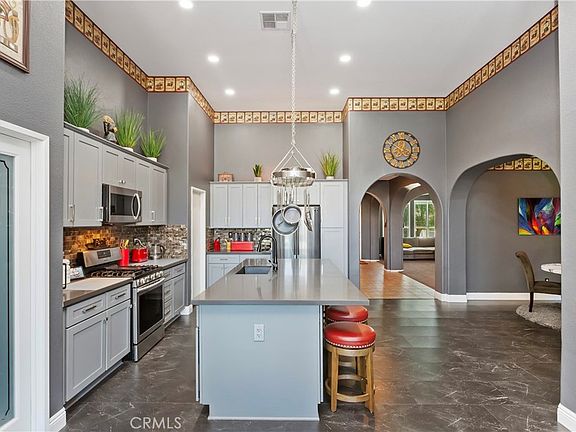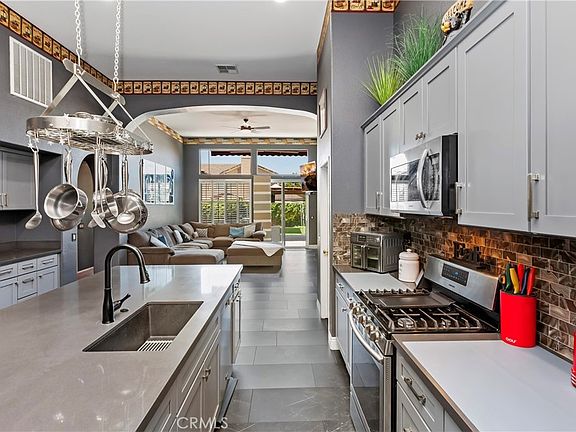 Don't miss out on this highly upgraded single story home in Menifee Ranch. This has been fully remodeled with new kitchen and baths. The kitchen has new cabinets with solid surface counters, stainless steel appliances, and upgraded lighting. This home has soaring ceilings throughout. There are custom ceiling fans and plantation shutters in the main living areas. the family room is located off the kitchen and has a remodeled fireplace with custom built-ins, plus slate flooring. The primary bath has floating vanities, a custom soaking tub and tiled shower. The guest bath has a custom vanity and tiled shower as well Front and back yards are landscaped. This property is just minutes from shopping and freeway access