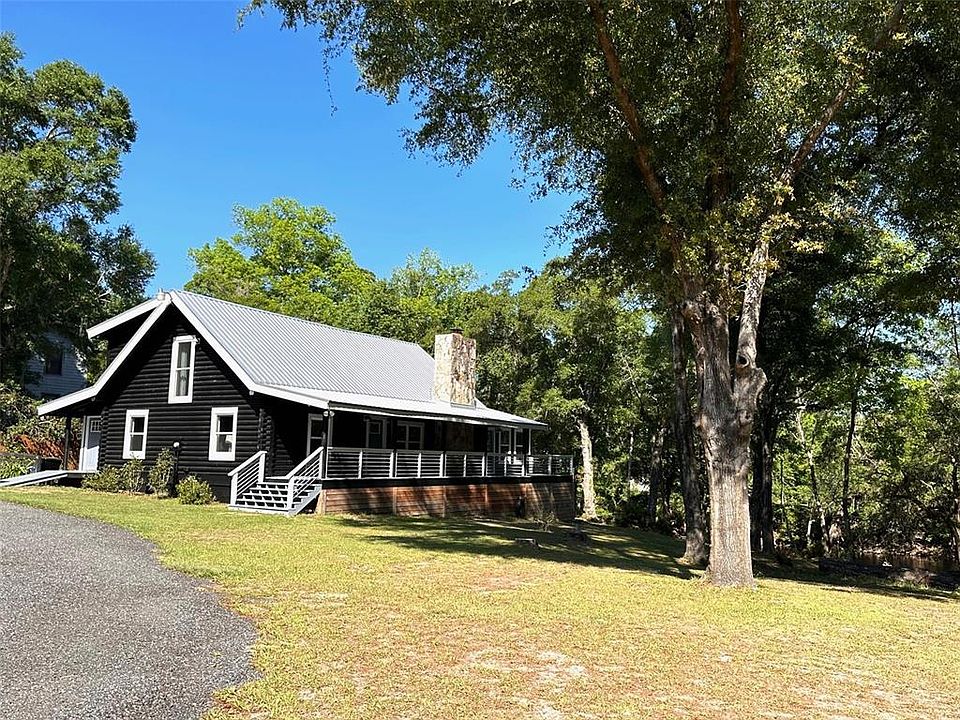 Stunning riverfront log home on 2+ acres! This gorgeous home sits high up with views of the Santa Fe River, just south of the Hwy 27 bridge outside of downtown High Springs. The home has been meticulously cared for and has been updated entirely throughout with freshly painted exterior paint & a new metal roof! There are 2 bedrooms and 2 bathrooms, with a loft and additional flex room inside the main home! Wood and stone floors grace this home along with a wood burning fireplace. The kitchen has a new farmhouse sink & butcher block counters with modern finishes along with an eat-in kitchen area and a separate dining room. Both bedrooms have walk in closets with additional closet space. Stop and sit a spell on the long covered porch or one of the other two additional private decks for many opportunities to relax and be captivated by the river view. Step outside to the front of the property and you will find a new 4 car carport, a horse barn that has been converted to a workshop with electricity AND another shed with a covered porch that has been converted to a "tiny house/office" that has a kitchenette, loft and toilet with an outdoor shower-making a great guest house! This corner lot has fencing all the way around it with two gates for multiple entry points. The possibilities for this beautiful property are endless - whether you are looking for a spectacular place to call home, or a Florida river getaway or an investment property for vacation rentals. Only 5 minutues to downtown High Springs that has restaurants, shopping & more! 30 minutes to Gainesville or Lake City. This is a special property that you are definitely going to want to see and make yours today!