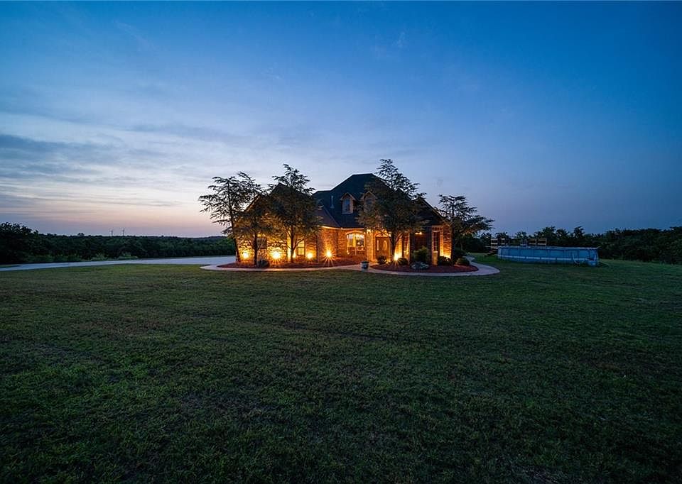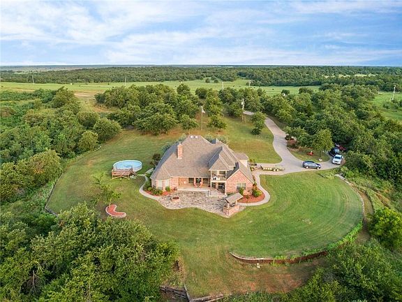 A house in the country built for entertaining! This beautiful executive home is situated on 50+/- acres over looking incredible views of the Caddo County valleys. Within 1 hour from Oklahoma City, this custom built home provides all the amenities needed to entertain your family or guests. It offers an open floor plan, 3 bedrooms, 3.5 bathrooms, walk-in closets, large office with built-in desk, media room, game room with pool table and bar, bonus room upstairs, three-car garage with built in storm shelter and much more! The living room features a built-in entertainment center and a custom rock fireplace. The kitchen features new stainless appliances and great storage and counter space. The master bedroom has large windows to enjoy the awesome views along with a master bathroom that includes a large custom tiled shower and oversized walk-in closet with built-ins. The media room upstairs provides surround sound and a large projector to watch the next sporting event or movie night.