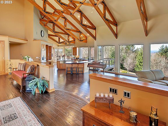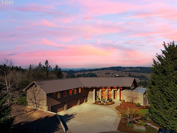 Welcome to this stunning view property located in the prestigious Parrett Mountain Estates community! Designed by an award winning architect to evoke balance, energy and rejuvenation, this beautiful place boasts a spacious 5,575 square feet of living space and sits on a sprawling 1.7 acre lot offering ample privacy and breathtaking valley views.As you enter the home, you're immediately memorized by the floor to ceiling picture windows, and greeted by the warmth of hardwood floors, to the architecture of the rustic wood beams in the living room and kitchen. The open, rustic and modern feel runs throughout the main level, featuring a gorgeous kitchen, large laundry room, plenty of storage and a primary bedroom with an en-suite bathroom, providing a relaxing oasis to start or end your day.The lower level of the home offers a large bedroom suite, and bonus room complete with a wet bar, perfect for hosting gatherings with friends and family. The upper level features another bonus room with a convenient kitchenette, two extra large bedrooms with a Continental bathroom, and expansive storage space. A flexible space that also lends itself to multi-generational living quarters.Step outside onto the expansive deck and take in the breathtaking views of the valley and mountains. The backyard features a lush grass area and a fire pit, providing the perfect space for outdoor entertaining and relaxation. A park-like setting with room for pool!And for the car enthusiast, you'll find an oversize 5 car garage, offering ample space for vehicles, storage, and hobbies.