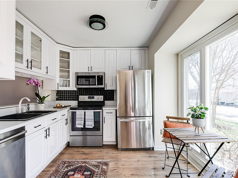 - Breakfast Area, Bay Window, Dining Area, Eat-in Kitchen, Fireplace, High Ceilings, Laminate Counters, Walk-In Closet(s), Window Treatments