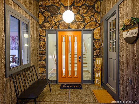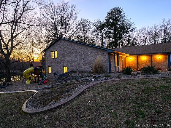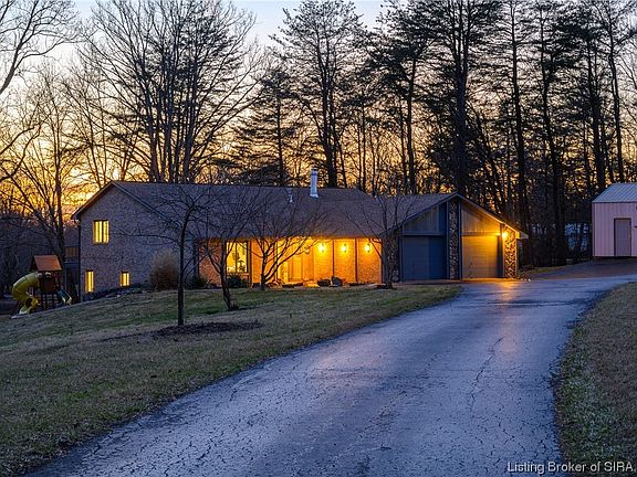 Peaceful, private and completely renovated home in desirable Floyds Knobs! Just a few minutes from major interstates yet it feels like a vacation with your view of the pond. This MCM custom built home includes over 4 wooded acres, pond access, pole barn and a long winding drive way. Inside is a gorgeous foyer with beautiful blonde hardwood floor and a main room that can be a bedroom or office. So much space in the oversized bedrooms upstairs with a balcony and lots of natural sunlight in the owners suite. Laundry is huge and located near bedrooms with tons of storage and closet space. In the lower level walkout you will find a 3rd bathroom, chefs kitchen, large formal living room and a cozy den with a fireplace. All of this overlooking the great outdoors! Glass doors off kitchen area lead to a covered area to enjoy the views. Pole barn (measures 30.5 feet by 24.2 feet) plus two car garage for storing cars, bikes and toys. Square footage, taxes, and school systems are to be verified by the buyer(s) or Buyer's Agent if critical to the buyer(s).