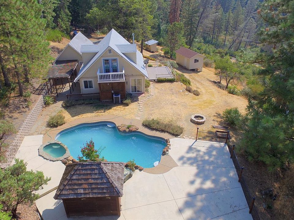 Special 2 story home in the Foothills on 5 acres. Spectacular views, custom built-in heated pool/hot tub and expansive patio surrounded by nature. Great for entertaining. Updated decor, light oak laminate & tile flooring, central heat and cozy wood burning stove. Large master suite with private balcony overlooking pool. Ideal property for a 2nd home/vacation getaway, or vacation income property near lakes and recreational trails. Private location with electric gated entrance. Outbuildings