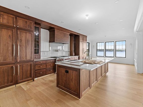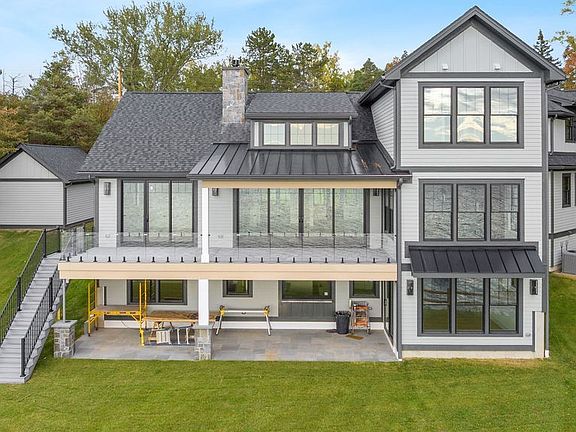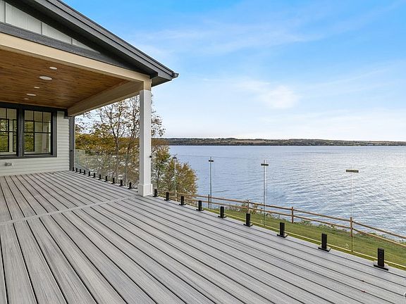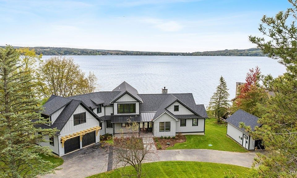 Gorgeous newly built home perched above the crystal clear waters of Skaneateles Lake. This stunning property boasts over 100 feet of private waterfront. The home is designed with meticulous attention to detail and features high-end finishes throughout. The open floor plan on the first floor includes a custom chef's kitchen with beautiful wood cabinets, quartz countertops, and top-of-the-line appliances. Large windows provide breathtaking views of the lake from every room. The vaulted ceilings with custom beams and stone gas fireplace add a touch of elegance to the space. The first floor also includes an office with custom built-ins, a primary bedroom with sliding glass doors to the deck and a luxurious ensuite bathroom, as well as a half bath and laundry room. Upstairs, you'll find a bunk room and two additional bedrooms, each with their own private ensuite baths. The partially finished walk-out lower level features a family room with a fireplace, a second kitchen, a second laundry room, and a bedroom and full bath. The property also includes an attached two-car garage and a separate one-car garage. Situated on a private lane just outside the village center, this home is located in the highly acclaimed Skaneateles School district.